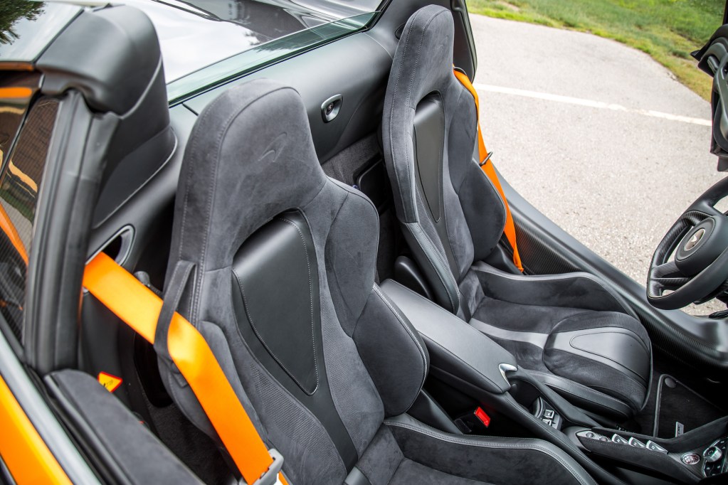 If the exhaust symphony isn’t up your alley, swing up the flashy dihedral gullwing doors and you will be treated to a charming interior, if you can get in. Doors that swing upwards aren’t the most ergonomic for ingress and egress, and the McLaren’s wide door sill makes it a bit of a chore for those less than flexible. In fact, most of my passengers have opted to just fall into the seats rather than trying to gracefully choreograph their torsos. Once you’re inside and have snuggled into the seats, you’re welcomed into an atmosphere that prides itself on functionality rather than visual party tricks.