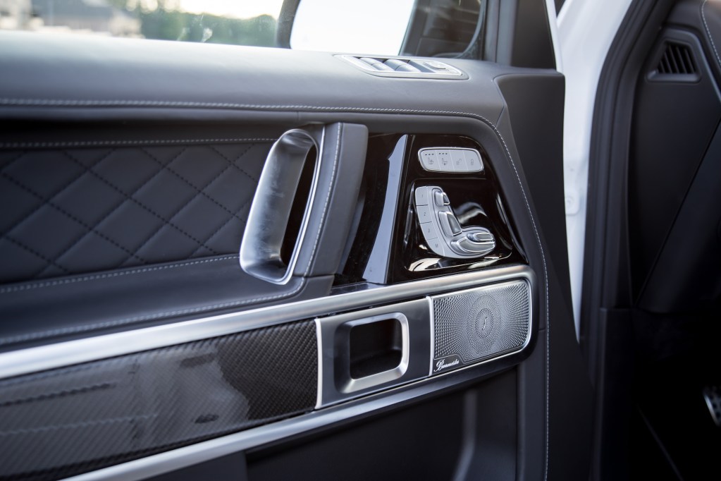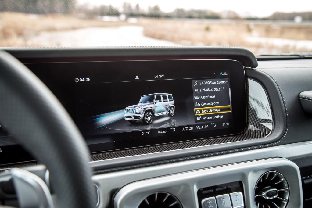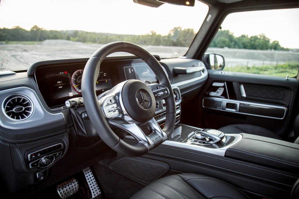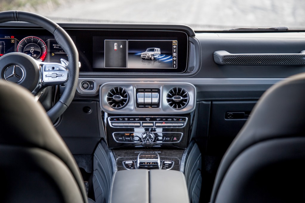 Inside you will find a Jeep-like upright windshield, shallow dashboard, grab handle on the passenger-side dashboard, and three differential lock buttons located front and centre. The G 63 AMG receives all the trimmings with a new steering wheel, dual 12.3-inch infotainment units stretching the dashboard width, and a beautiful marriage of carbon fibre, metal, and soft leather. You can add those little driver toggles budding out the steering wheel much like the GT 4-Door, but personally I would leave that box unchecked. While convenient especially when Sport+ mode is needed for those last minute overtakes, the buttons themselves feel exceptionally low-rent, they aren’t fixated to the wheel with the same solidity as other panels in the interior, and they squeak under operation like those old Hasbro action figures.