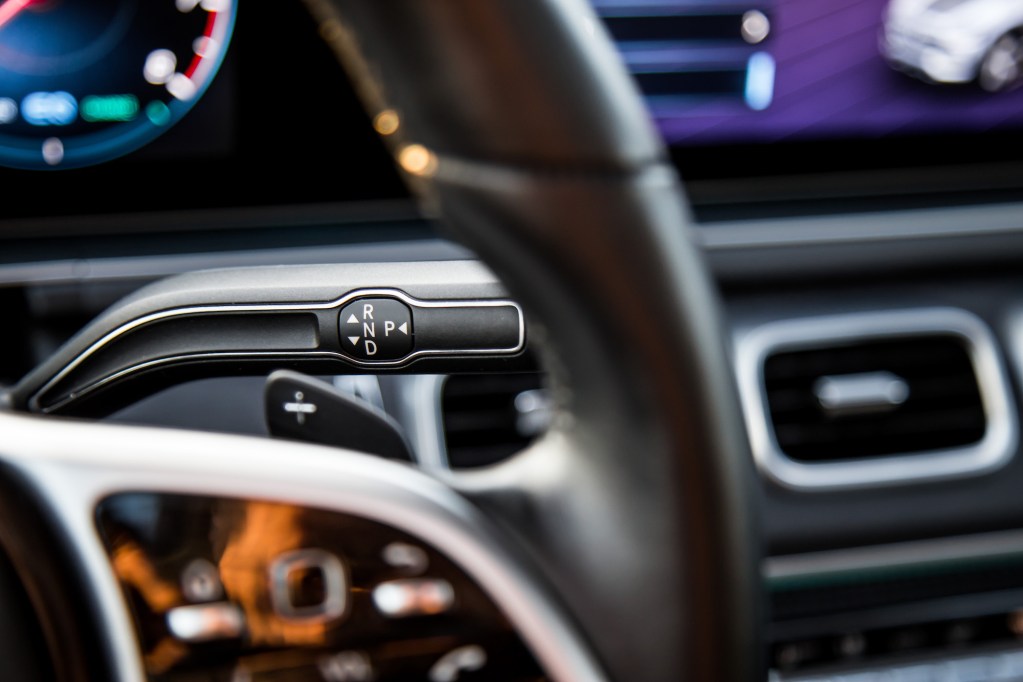 The remainder of the interior is taken straight from the GLE, including an expansive dual 12.3-inch screen setup mounted on the dashboard, rectangular air vents, and Cayenne-like grab handles bordering the center console, alluding to its go-anywhere abilities. Elsewhere, leather, metal, and bare wood caress high traffic surfaces, including the airbag cover of the moderately padded steering wheel.