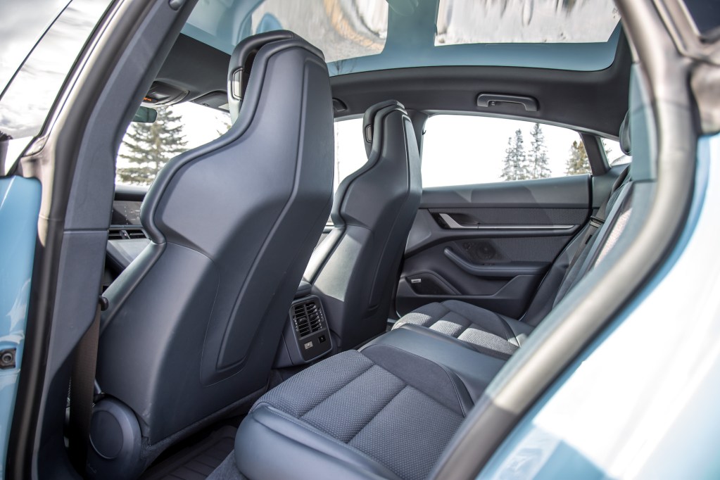 Fingerprints will mar the screens no matter how diligent you are with cleaning, though they’re bright enough that they won’t wash out easily under heavy sunlight. Those who prefer the direct tactility of real buttons will be disappointed but those looking towards the future of technology will find much to love. The build quality is exceptional, the fixed panoramic roof is expansive, and the Taycan does a stellar job balancing out the right kind of simplistic and futuristic EV vibe that it wants to convey. The driving position is spot-on too, with the Taycan’s pronounced front shoulders mimicking the view out of a 911. The 18-way adjustable seats are supportive but the stiff and high thigh bolsters are a pain for male-specific ingress and egress. Place your buttocks strategically unless you want some bolster protrusion. And for such a large sedan, rear seat accommodations are sparse. Headroom is just enough for my six-foot figure, but my knees are crammed right into the seat back when sitting behind myself. Seems silly for Porsche to charge an extra $550 to get a middle seat as well.