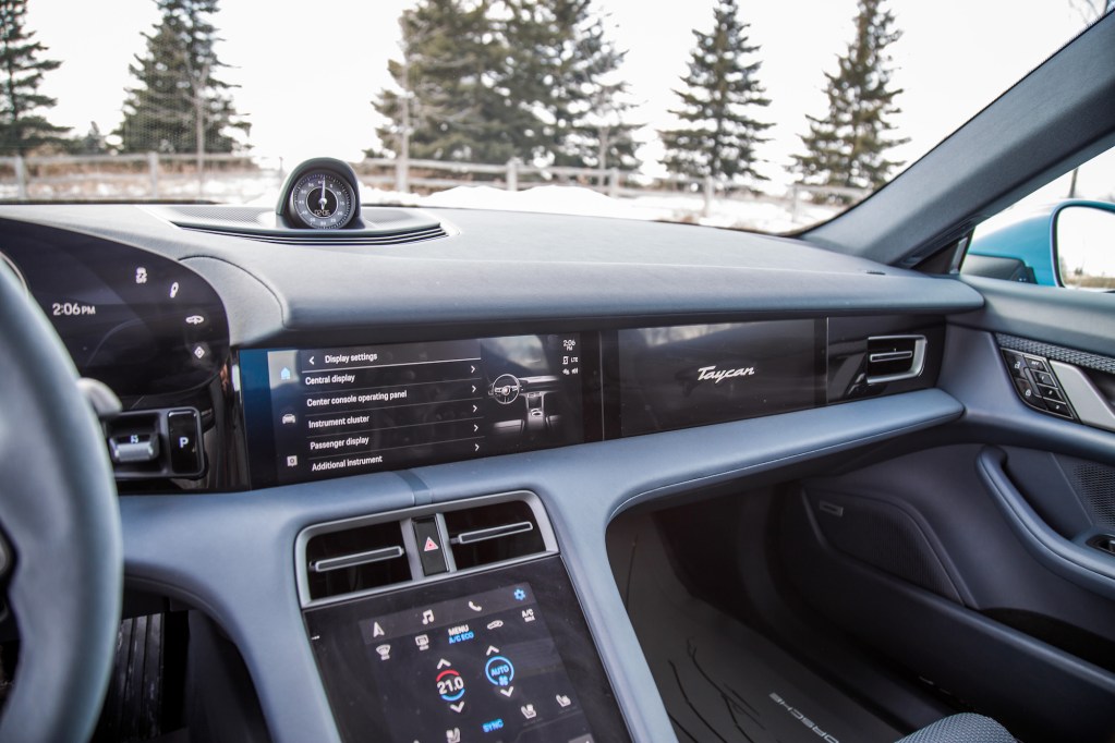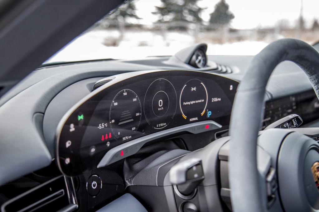 The flat and thin steering wheel is a delight but the plastic drive mode dial budding out the lower right corner feels low-rent and lacks the premium appearance of the AMG equivalent. I do love having a shortcut button on the steering wheel, though. More automakers need to implement this as more and more user functions transition over to touchscreens. Oddly enough, Porsche limits what you can actually program into the button. We had ours set to activate the spooky Porsche Electric Sport Sound function that pipes spaceship noises both inside and outside the vehicle. Ever hear a Taycan accelerate? It’s like they pulled an audio clip from Star Wars. Of note, like other hybrids and EVs, the Taycan has to emit these kinds of white noises to meet legal requirements – Canada doesn’t want you to silently and accidentally run over unexpecting pedestrians in the parking lot.