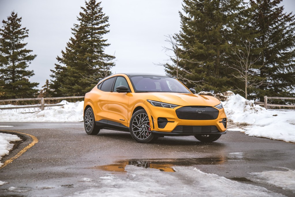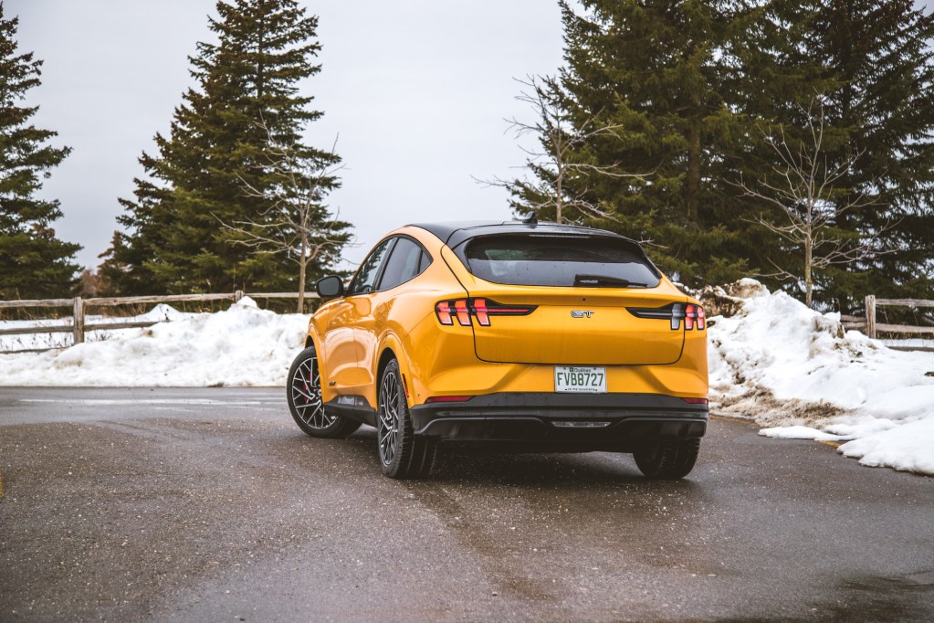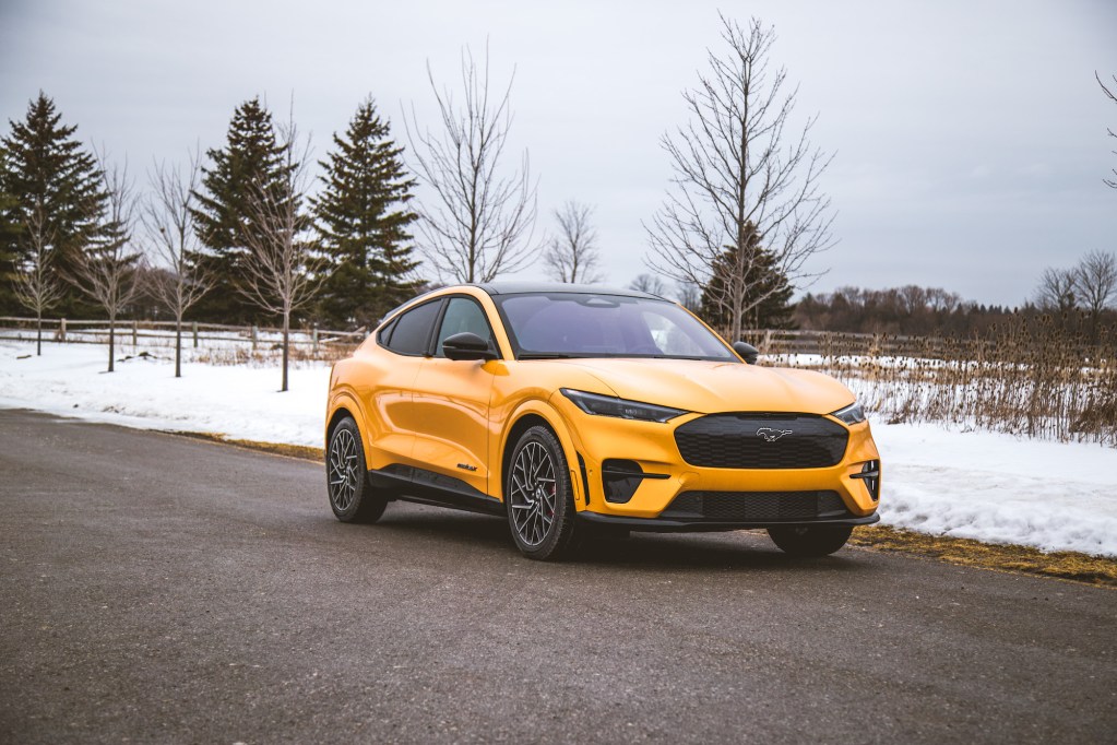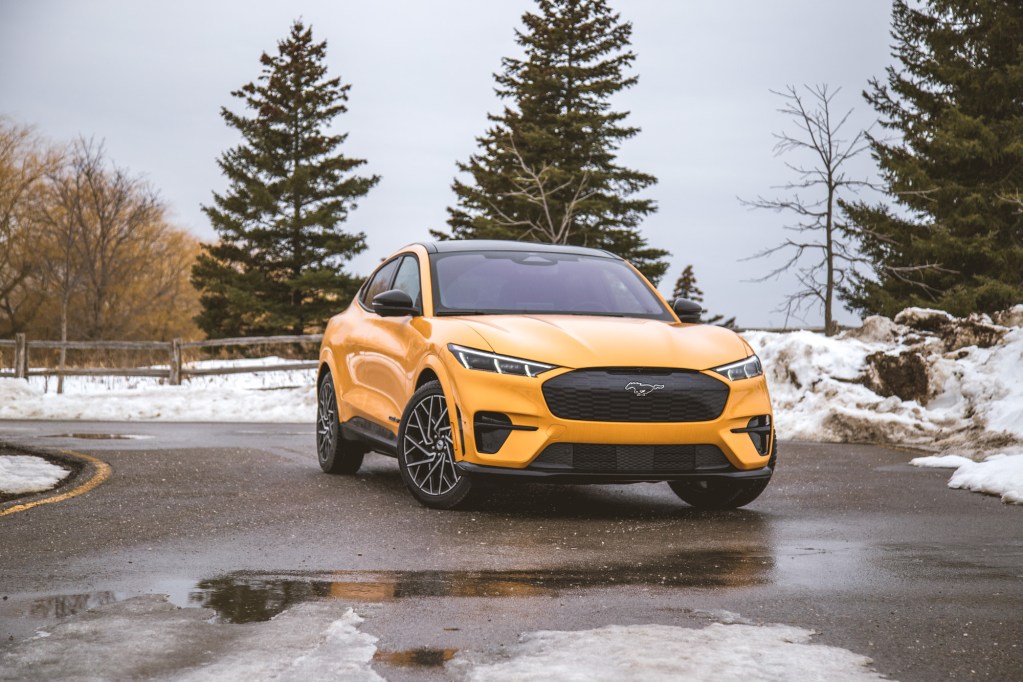 The GT receives larger Brembo brakes, MagneRide dampers with a revised suspension, and sleek 20-inch wheels – our test vehicle wore Pirelli Sottozero winter rubber. The front bumpers are more aggressive and flared, the closed grill adorns a mesh-like design, a large GT badge is plastered on the rear trunklid, and there’s an exclusive Cyber Orange paint colour like in our photographs – comes off more as yellow to us though. Inside are new sport seats with additional shoulder padding and a GT badge on the center armrest. All of this comes at a premium – the GT starts at $83,495, or $34,500 more than the most basic Mach-E.