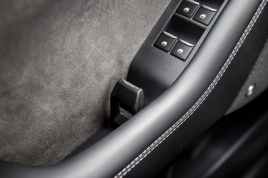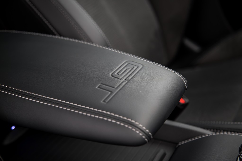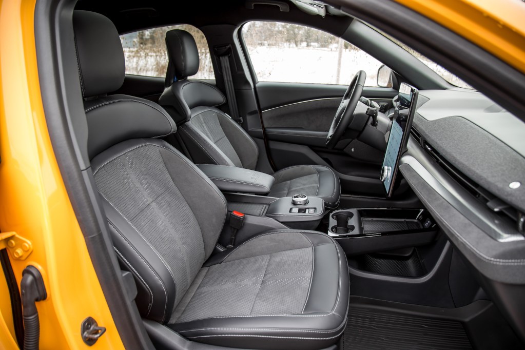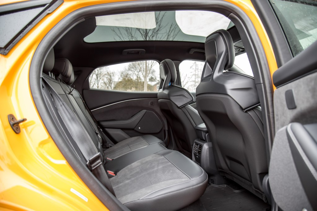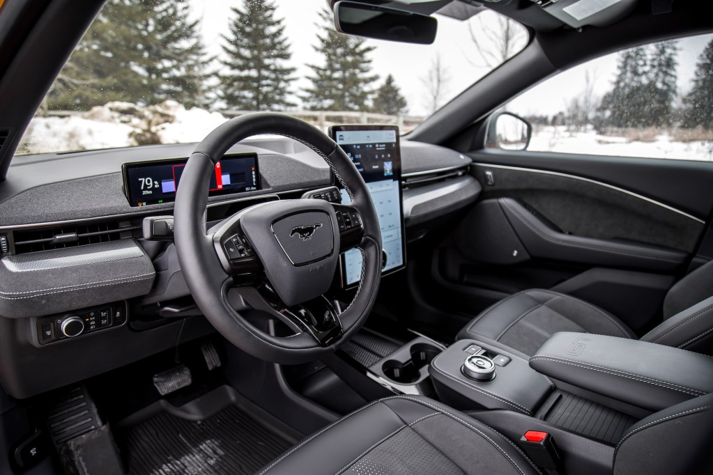 The GT’s new performance seats are more comfortable with the extra shoulder padding on each side. Still, and like the regular Mach-E, the driving position is odd, with the seat bottom not able to recline back enough, so you always feel like you’re sitting on top of the car, rather than in it. The rest of the cabin is spacious and airy thanks to an open center console area and expansive sunroof. It’s inviting from a distance, and there’s nice leather stitched onto the seats and door panels, but up close reveals flimsy materials and a general sense of low-grade craftsmanship. Having a gear selector that wiggles around under operation doesn’t exactly scream quality.