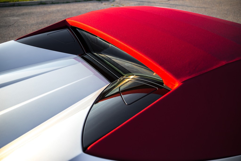 The Huracán EVO Spyder adorns the same basic shape and silhouette as the Coupe but with less roof rake and the loss of the transparent glass cover that lets you peer into the engine bay. Unique to the Spyder is a lowerable rear window that floods the interior with intake and exhaust noise. Grigio Nimbus isn’t your typical, flamboyant Lamborghini paint colour but it suits the Huracán’s edgy lines and looks sensational in golden hour glow. It melds and compliments the backdrop instead of seeking the spotlight. The red fabric roof makes for a stunning spec as well.