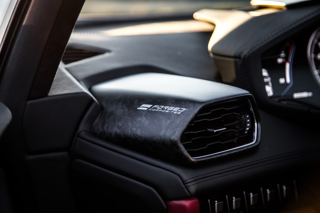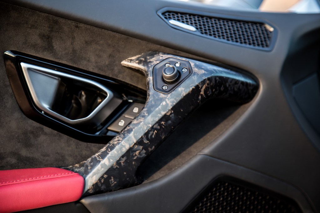 The optional sport seats are comfortable, more supportive than the deep dished seats in the 570S, and we had no backache complaints even after a few hours behind the wheel. If those aren’t racy enough for you, Lamborghini also offers lightweight carbon fibre bucket seats wrapped in Alcantara. Synthetic suede is nice and all, and so is carbon fibre, but we’ve got a sweet spot for forged carbon composites. While they’re cheaper to produce than traditional carbon fibre, they’re just as strong, and like a marble countertop or wood panel, the random grains and patterns make it that much more unique. Our Huracán had it installed on the air vents, door handles, and paddle shifters, but you can go so far as to equip them on the center console and door sills as well.