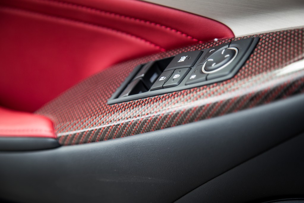 We get why Lexus charges $120,000 for one of these, though. Carbon fibre isn’t cheap, especially when it covers so much surface area on the RC F. German automakers typically charge at least $10,000 for a set of carbon ceramic brakes too, so there’s that. Doesn’t seem cheap to manufacture that beautiful red coloured weave into the door panel’s carbon fibre either. On a side note, we did discover that the RC F was weirdly fuel efficient, so there’s some money to be saved. Cruising around town and the highway with a judicious right foot and light throttle application averaged us an impressive 10.3 L/100km. For a naturally aspirated V8 coupe, that’s incredible, and really boils down to the engine utilizing a more efficient Atkinson cycle at low speeds, and switching to an Otto cycle for more performance.