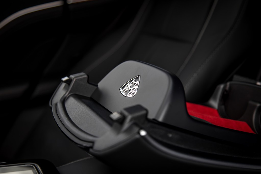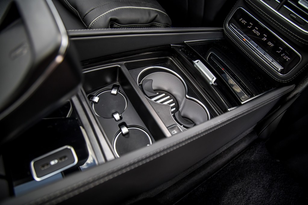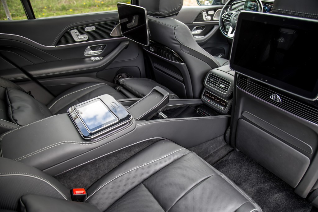 A wood-trimmed center console hides fold-out picnic tables just like on an airliner, a refrigerator with champagne flutes is mounted in the rear console, and there are chilled and heated cup holders with a dedicated clamp for your champagne glasses, locking them at their stem so they don’t wobble around during travel. There is even a tablet that handles all the vehicle functionality should you not want to use the rear entertainment screens instead, though I am a little divided on the wireless smartphone charging pad that sticks out like a sore thumb, which cannot be retracted.
