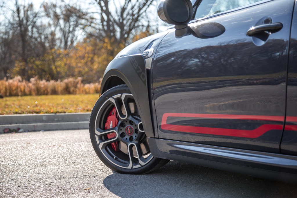 The GP only comes in one spec: Racing Grey Metallic body with a Melting Silver roof, red accents under the front grill, bumper, rear spoiler, and side aprons, and a black interior. There are no options available. Our GP is #2870, out of 3000, and it’s neat how MINI displays that model number not just on the dashboard panel or a hidden plaque inside the car, but also on the carbon fibre fenders, visually identifiable by everyone on the road. I love that. It makes every GP feel even more special on its own.