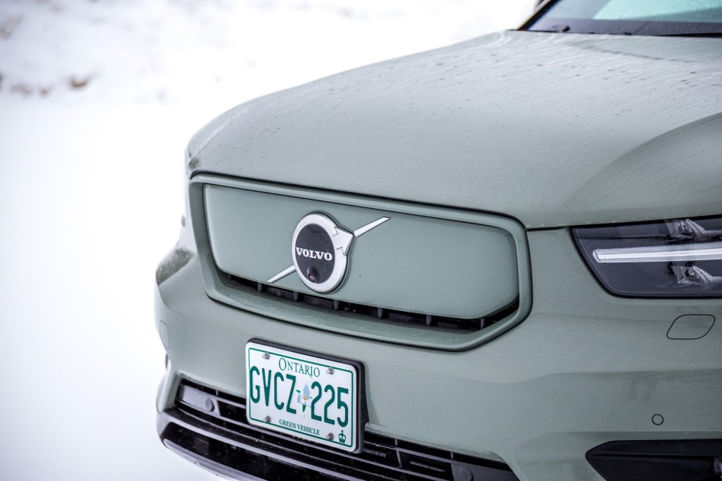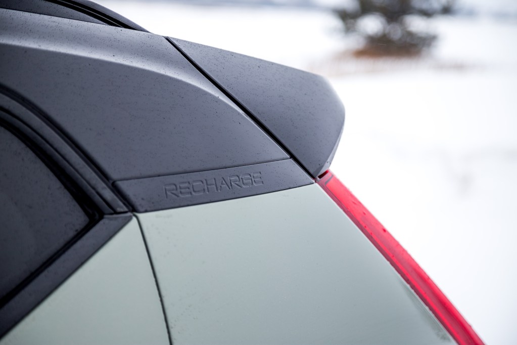 The XC40 Recharge is instantly recognizable as a Volvo with its sleek Y-shaped headlights, tall rear lights, and contrasting black roof, but there are subtle cues that distinguish it from its fossil fuel burning brethren. Obviously, there are no tailpipes running out back, but the front grill is also solid and body-coloured since it doesn’t need air intakes to cool any combustion engine. You can spot the Recharge badges along the C-pillar, tailgate, and sill plates, a charging port above the driver’s side rear wheel, as well as unique 19- and 20-inch wheels and exclusive Sage Green paint that you won’t find on any other Volvo.