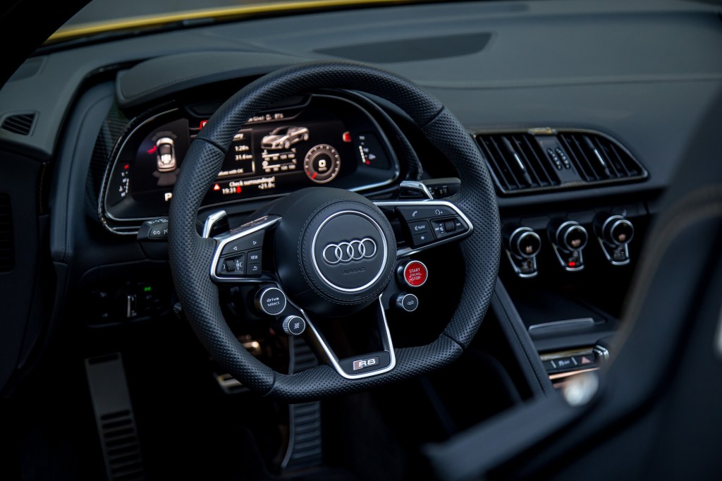 In our opinion, the R8 was meant to be topless. The Spyder adds that extra sense of occasion, as does the neck-breaking coat of Vegas Yellow paint. Not everyone will appreciate the overdose of Vitamin D but when the R8 stimulates your senses the way it does, it would be a shame not to, and the subsequent dopamine rush becomes addictive – V10 pinging right behind your ears at 8,700 rpm, the smell of summer grass in the air, crisp gales of wind crashing through your hair, and if you must complete the sensory checklist, the taste of the quilted leather.