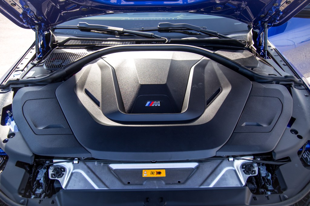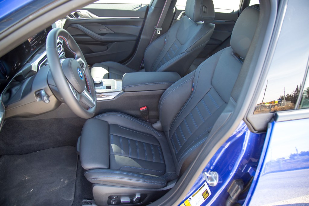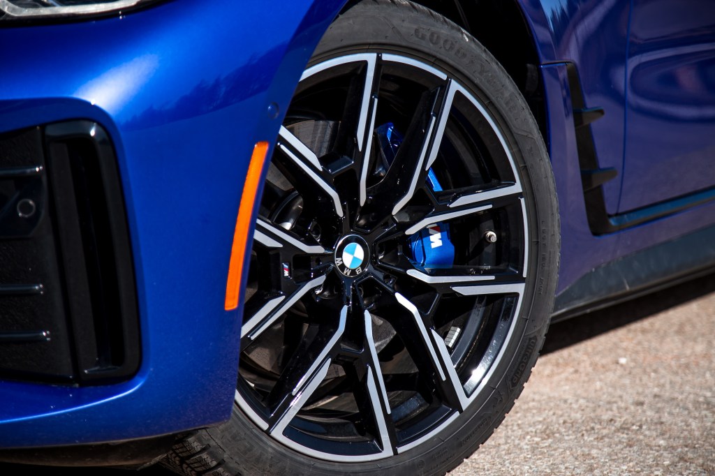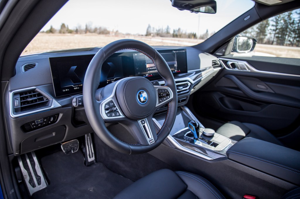 Both i4 models come standard with a rear air suspension, but the M50 is further equipped with an adaptive sport suspension, variable steering, and stronger M Sport brakes. Many of the exterior elements are finished in Cerium Grey, and optional 20-inch wheels are available though ours wore 19-inch winter rubbers. Its profile is aggressive, though the ride height appears to be slightly higher than a regular, fire-burning M440i Gran Coupe, probably to make room for those batteries hidden in its underbelly.
