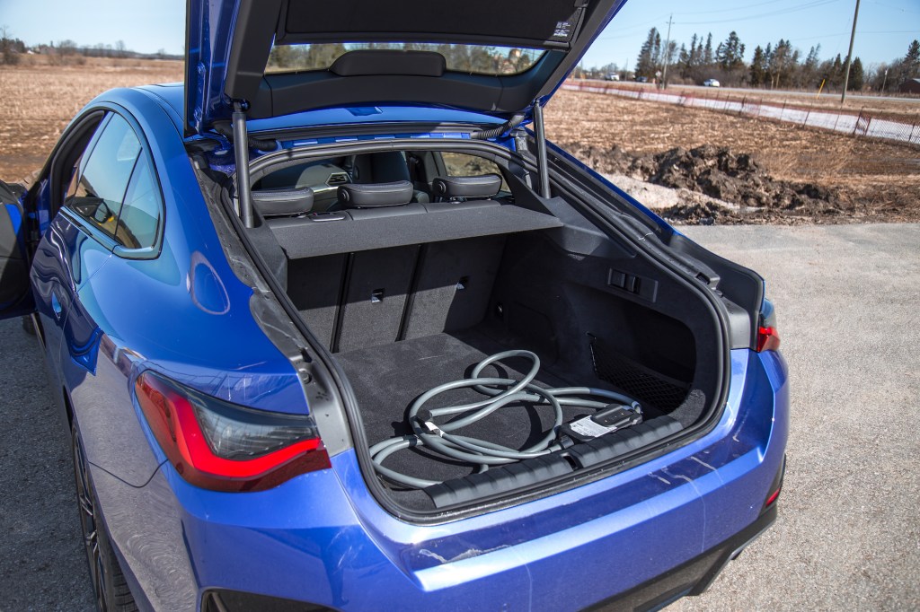 That extended roofline in this fastback sedan pays dividends to rear seat headroom but the sloped shape means it’s still not enough for my six-foot figure to find comfortable. My head nudges right into the headliner, and my knees are equally as cramped, shoved right into the front seatback. The hatchback liftgate means cargo storage is exceptional and along with the flexible electric range, adds to the i4’s road trip capability. That said, unlike some other EVs there is no front trunk storage, so what you see in the cabin is what you get.