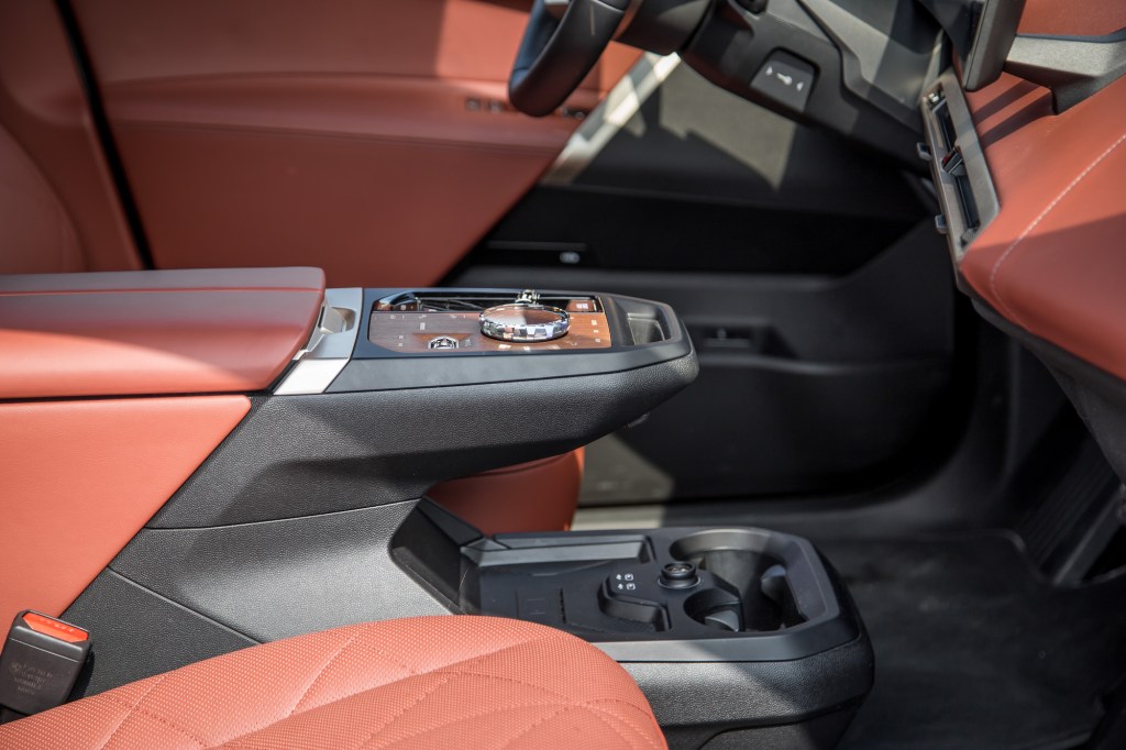 The interior is another story and this is where we think the iX truly leads the EV segment. There’s just so much yet so little going on. The layout is clean, colourful, and crisp, especially in this red on red spec. The expansive dashboard effectively accentuates the cabin’s width, and houses the new dual screens mounted under a piece of curved glass. Soft leather is laid out on all the high traffic areas, and there’s beautiful glass switchgear for the seat controls and infotainment dials, all of which make the iX feel more expensive than it actually is. This kind of material quality is normally reserved for brands like Bentley and Aston Martin.