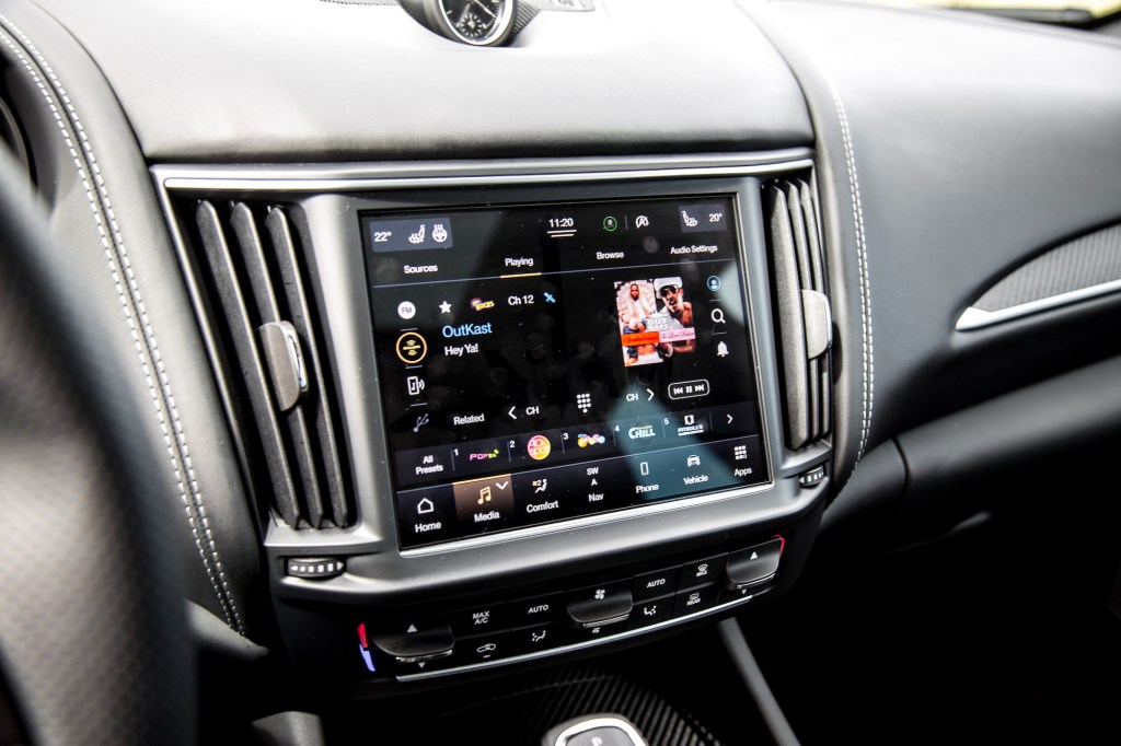From afar, the Levante’s cabin appears grand and upscale, and it is in some areas, like the optional Ermenegildo Zegna Pelletessuta ($8,000) leather textile embedded into the seats. It’s like sitting on a precious Italian handbag. The large metal paddle shifters are satisfying to curl your fingers around, and crisp analog gauges remind us of a time gone by, as does the nostalgic clock sitting on the dashboard. But the rest of the switchgear is a letdown at this price point, and will irk those comparing the fit and finish to that of a Porsche Cayenne or BMW X5. In this light, the Maserati is clearly inferior, but we would spring for a lighter-coloured interior like red or brown to better elevate its shapes and accents. The doors are oddly heavy, something we’ve noticed with all modern Maseratis, but that could be because they are frameless – not something you usually see in large SUVs – and they are soft-close.