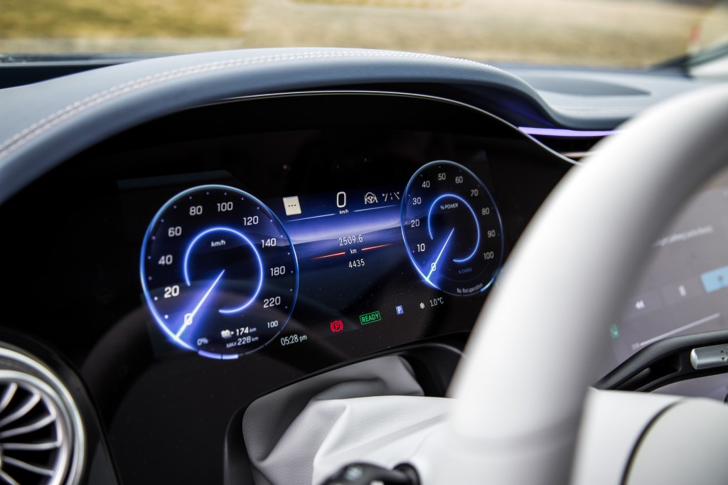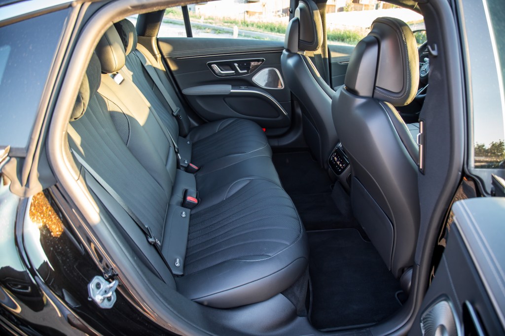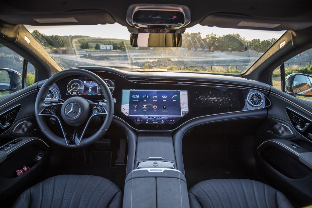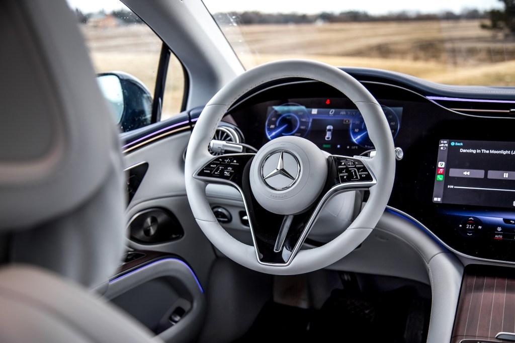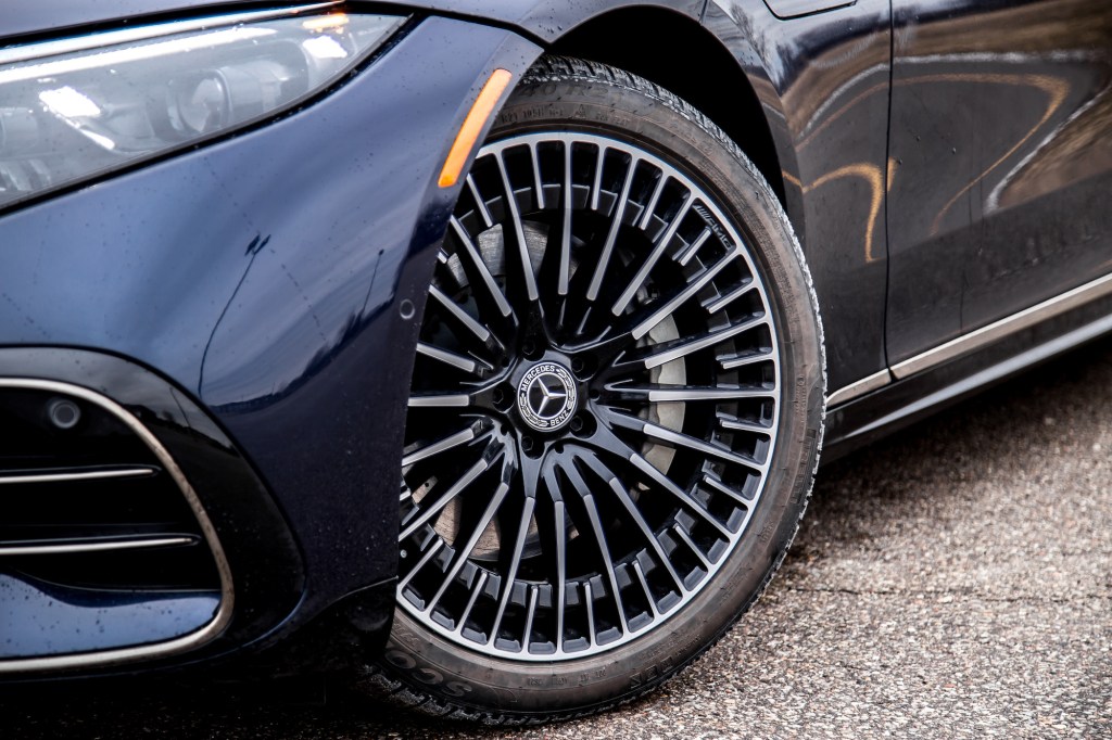 The rear axle steering here is a gamechanger, as it moves the rear wheels up to 10-degrees. That’s more than double traditional rear-wheel steering systems, paying dividends to manueverability, especially in tight parking spaces where the EQS wiggles around like a Nissan Micra. That’s not an exaggeration. It’s incredible, yet it also means the steering rack can feel hyper sensitive to input as the rear end is suddenly so reactive and playful. We often found ourselves using too much steering rotation, and had to constantly backtrack and recorrect. No, it doesn’t come close to the agility of a Taycan Turbo, but the EQS is still surprisingly fun to provoke with oversteer under hard cornering, and it remains planted with more than sufficient AWD grip.