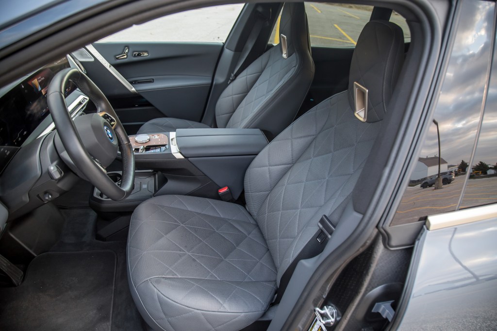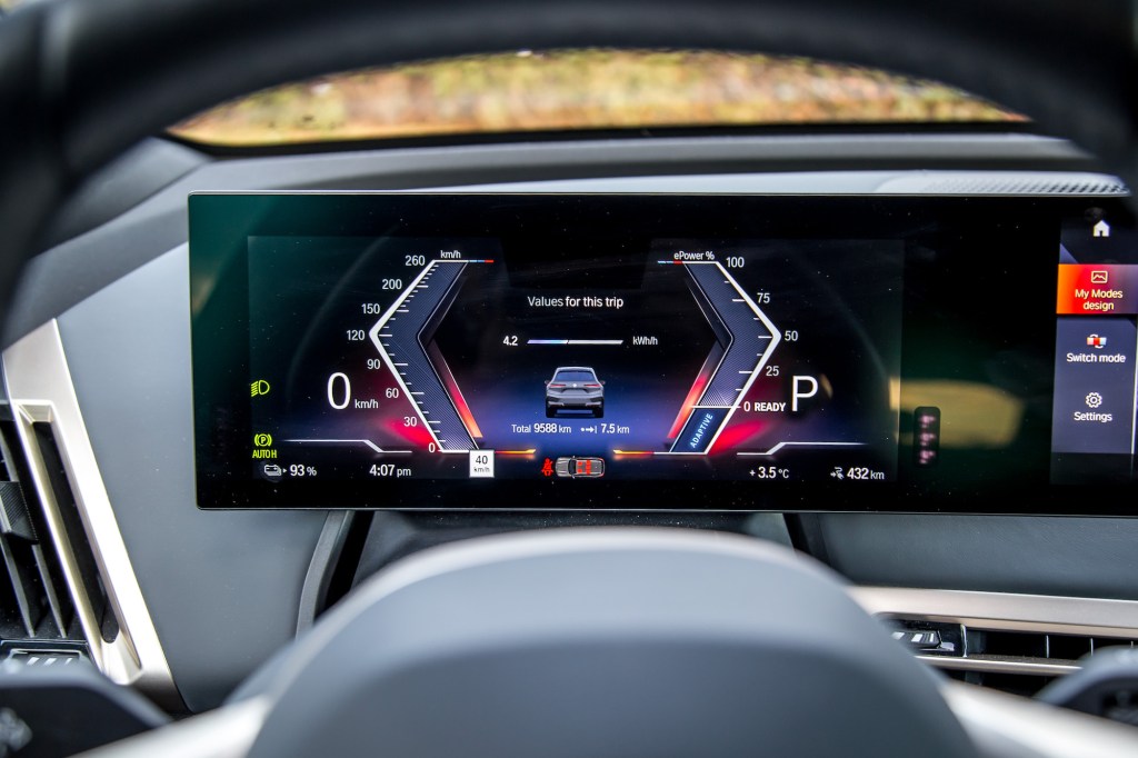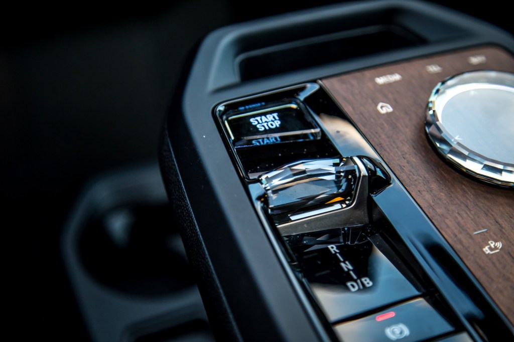 The interior is a first-rate piece of kit. There’s so much yet so little going on. The layout is clean, contrasting, and crisp. The expansive dashboard accentuates the cabin’s width, and houses the new dual screens mounted under a piece of curved glass. Soft leather is laid out on all the high traffic areas, and there’s beautiful glass switchgear for the seat controls and infotainment dials, all of which make the iX feel more expensive than it actually is.
