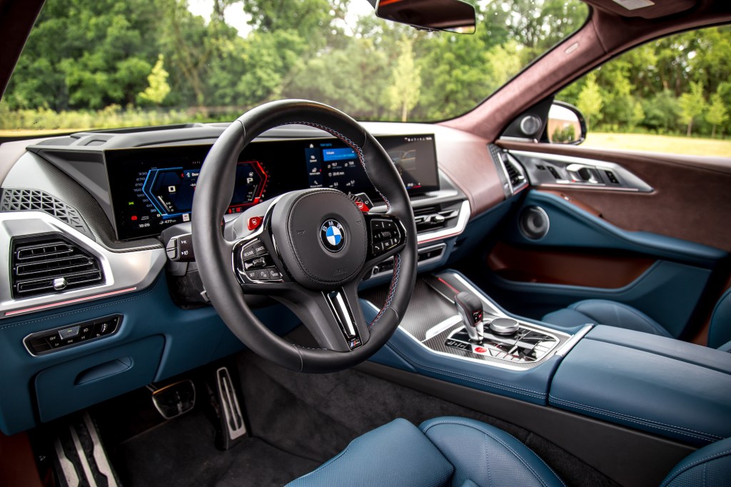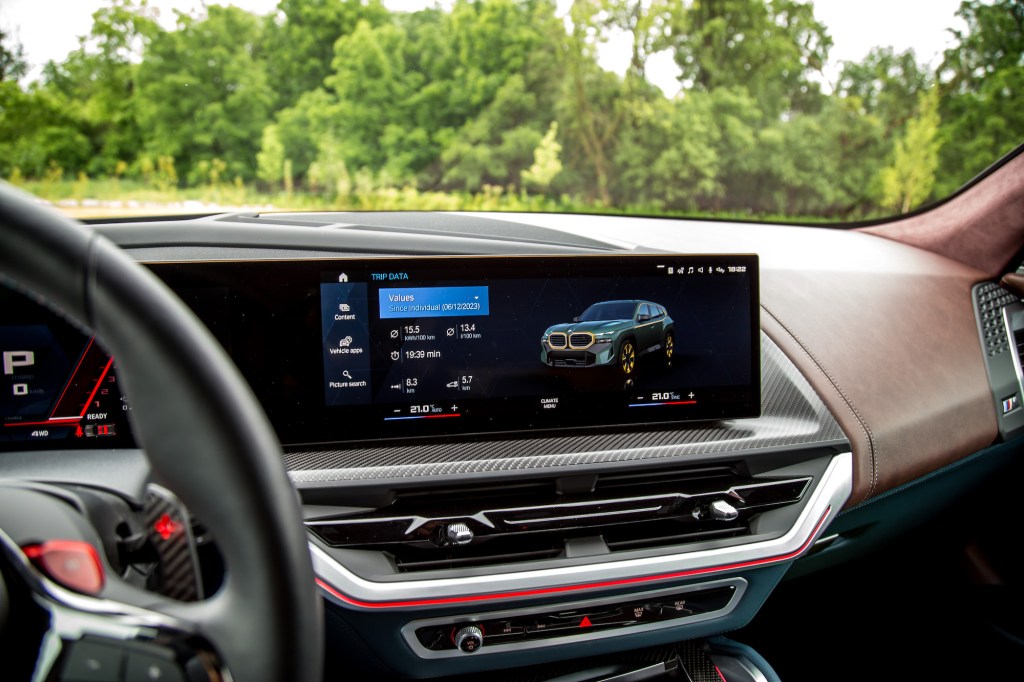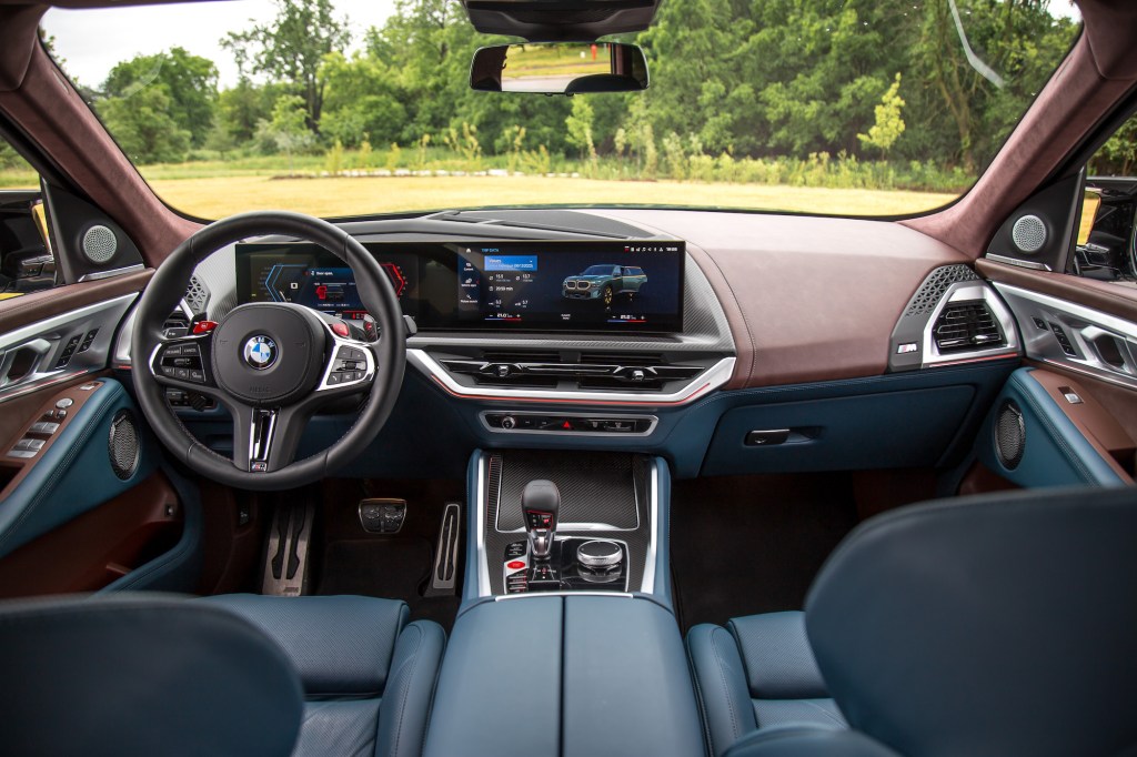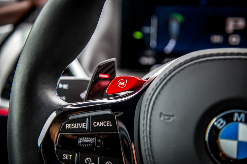 The driving position is excellent for an SUV but the steering wheel doesn’t tilt down enough, a complaint not exclusive to the XM. We’ve noted the same issue in the X6 and X7. But it’s an excellent wheel, sporting the same basic design as an X6 M but with glossy black accents with a bit of reflective tint to give it some differentiation. There are hard buttons to control the infotainment and driver assistance features too, and none of those fussy haptic touchpads found in rivalling Audis and Mercedes models. There are also red M1 and M2 buttons, allowing drivers to program their preferred drive settings and access them quickly.