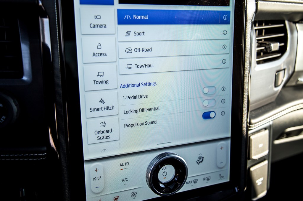 And the sensation of speed is eerie too. Despite how quick it is, it emits almost zero noise – none of those spaceship vibes or fake auditory whirls. Add to that its excellent wind and tire insulation and dare we say it, the F-150 is one serene road cruiser. Of course, you can add propulsion noise if you so choose via the car’s menus, and you can activate one-pedal driving while you are at it, allowing you to just drive with the gas pedal. Letting off the pedal will engage braking. Unfortunately, there are no strengths of regeneration available – it is either on or off.