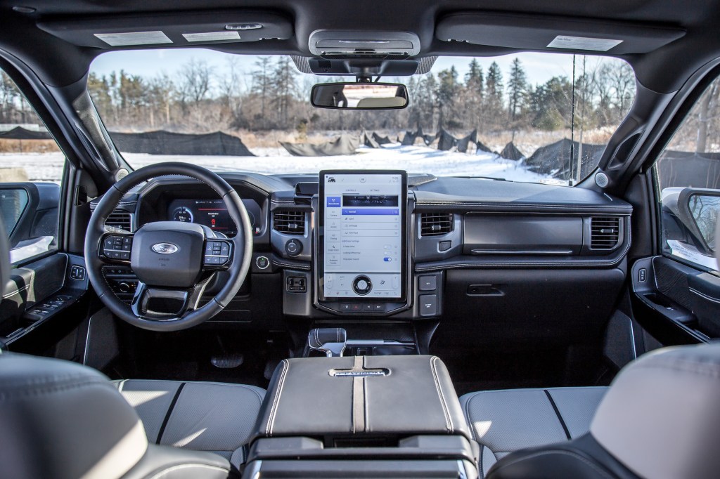 The interior remains the same as the regular F-150 – there are no fancy gadgets or ambient lighting like the other six-figure EVs we’ve recently driven. Instead, it’s a utilitarian, durable, and practical cabin filled with a plethora of storage cubbies, a vertical-oriented touchscreen to control every vehicle function, and even a fold-out work table to place your laptop or enjoy a takeout feast. It’s a handyman’s treasure trove, and the build quality appears to be much better this time around, with fewer loose panels and a more sturdy overall fit and finish.