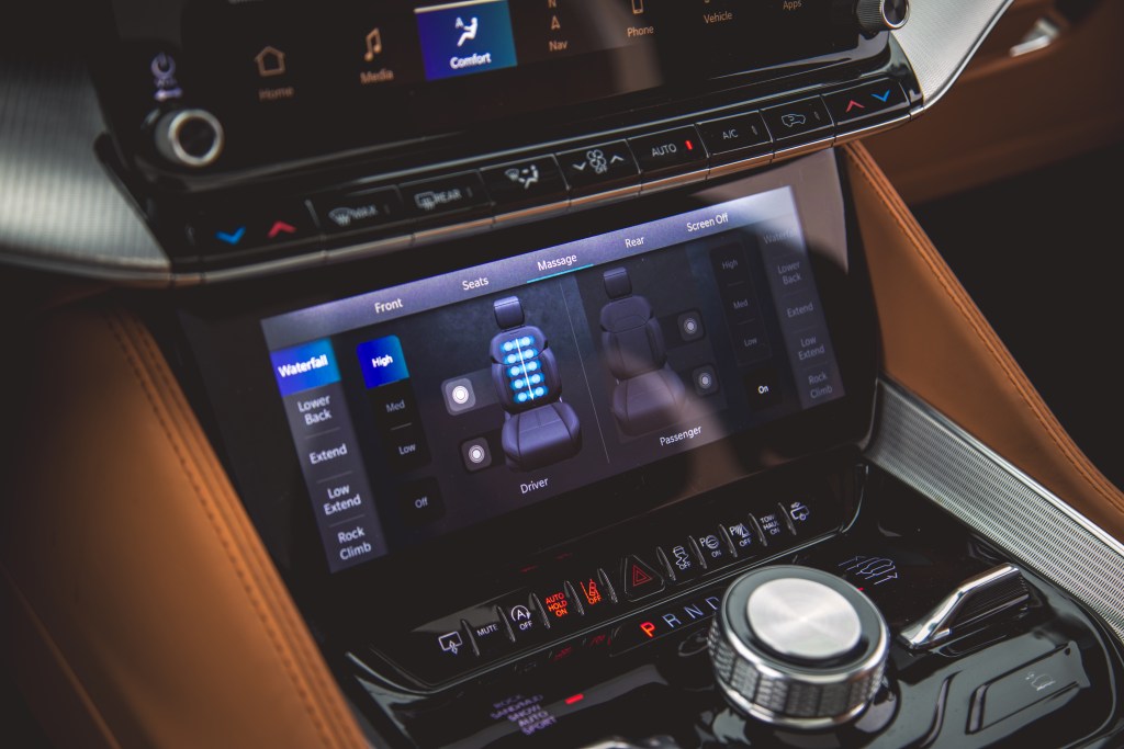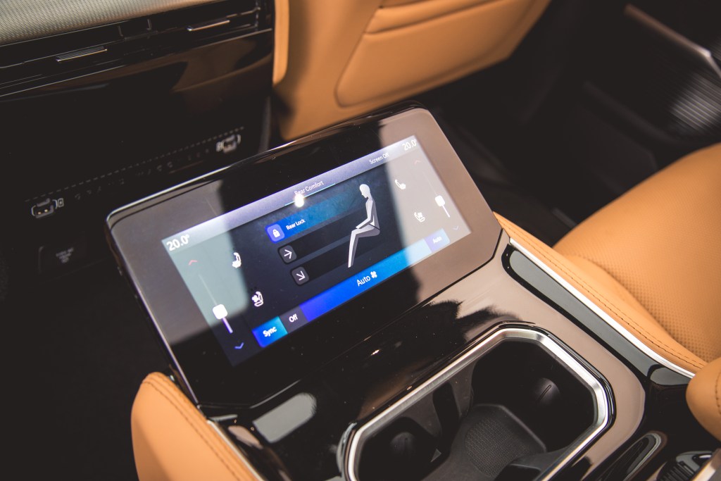 The Grand Wagoneer features an array of digital screens, with four located in the front and three more in the rear. The driver’s instrument cluster is bright and clear, but the center two take the spotlight. Crisp, reactive to inputs, and lag-free, it’s a tech haven for the latest features and creature comforts. The bottom screen is mainly delegated to seat functions and massage but hides a storage cubby behind it accessed via a dedicated button. Here is where the wireless charging pad and HDMI port sit. It compliments the other clever storage areas such as the optional cooler box under the center armrest.