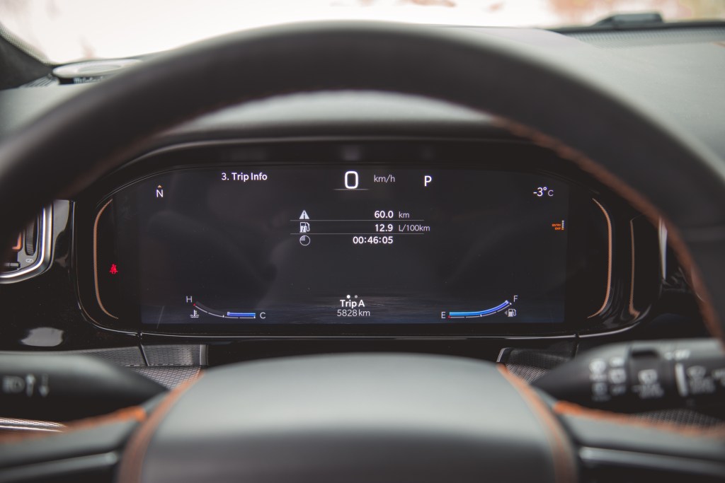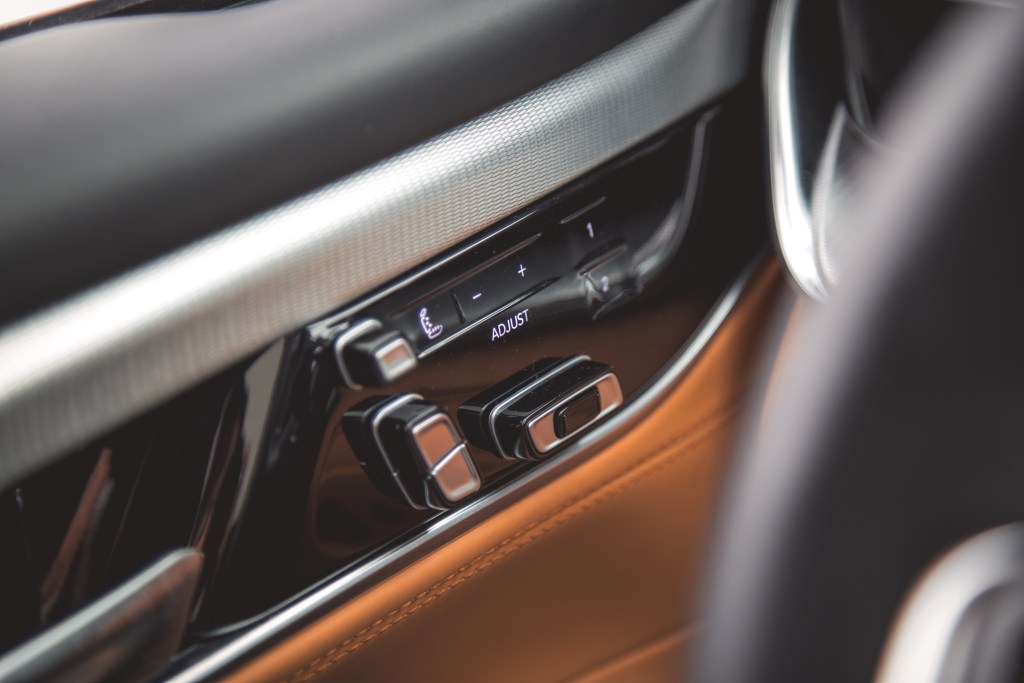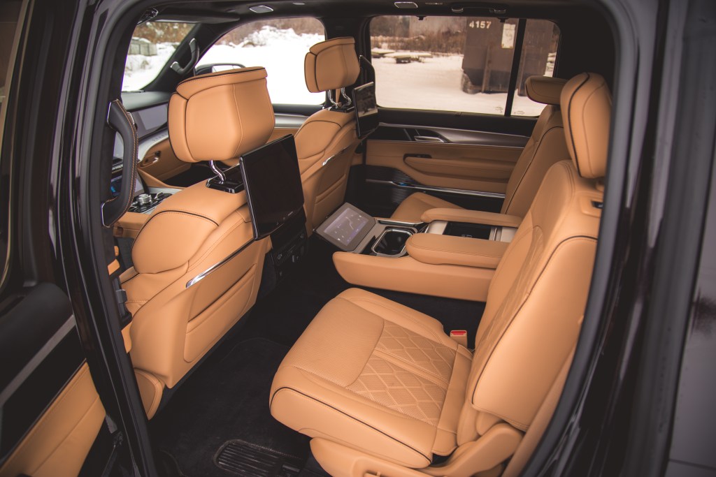 The cabin continues to impress us with its emphasis on American luxury. The front seats might as well be re-categorized as sofa chairs, with leather meeting wood accents and chrome trim, all married together with convincing hard plastics. The fit and finish are notably inferior to anything from BMW or Mercedes but the clean mix of colours, shapes, and digital real estate cleverly covers it up. The two-spoke steering wheel is beautifully crafted, featuring a cut-out bottom half similar to that of the new Genesis models. Small buttons flank the back, where paddle shifters would normally sit, to control the volume and audio tracks. However, like the signal and wiper stalks, they easily feel like the cheapest touchpoints of the Jeep.