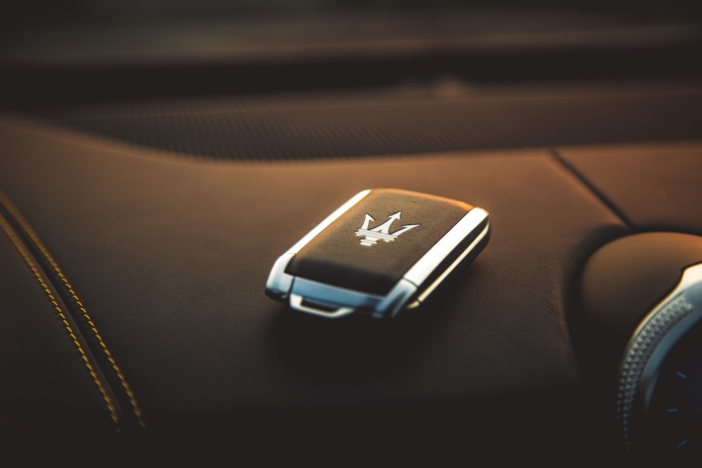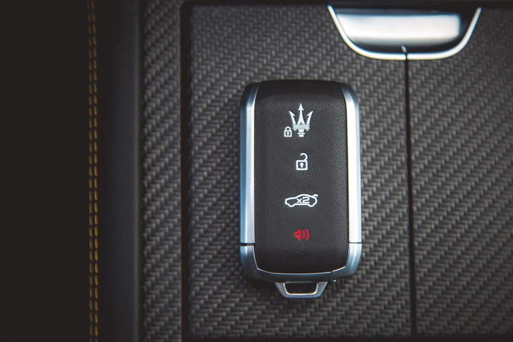 The absence of a gear lever has freed up precious center console real estate, and Maserati commissioned an oddly shaped, trap-door-style cubby, which looks neat but, in practice, gets in the way and could have been more functionally designed. It reminds us of the Mercedes center cubby, an example of form over function. But we love the weighty new key fob. It’s slimmer than the previous obelisk, but no lighter, and we love how it stands as a fashion piece to complement the rest of your fancy keychains.