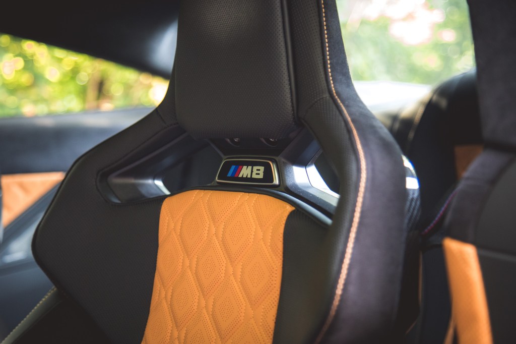 The seatback only adjusts fore and aft, and there is no headrest adjustment either. Not that you need them – the seat is so snug, racy, and comfortable, and it can be lowered very far to the ground so you feel like you’re almost touching the tarmac below. There are holes for multi-point seat belts and they are lighter in weight than the standard sport seats but we don’t think by much, as they still have heated and memory functions, as well as electronic adjustment. Even the M8 logo illuminates at night.
