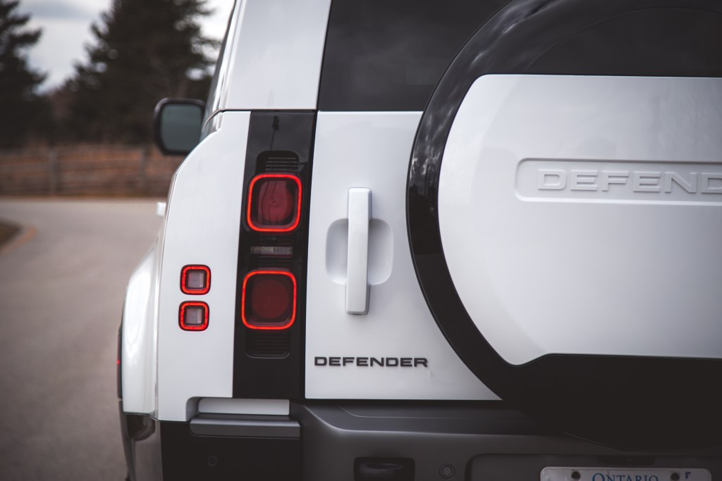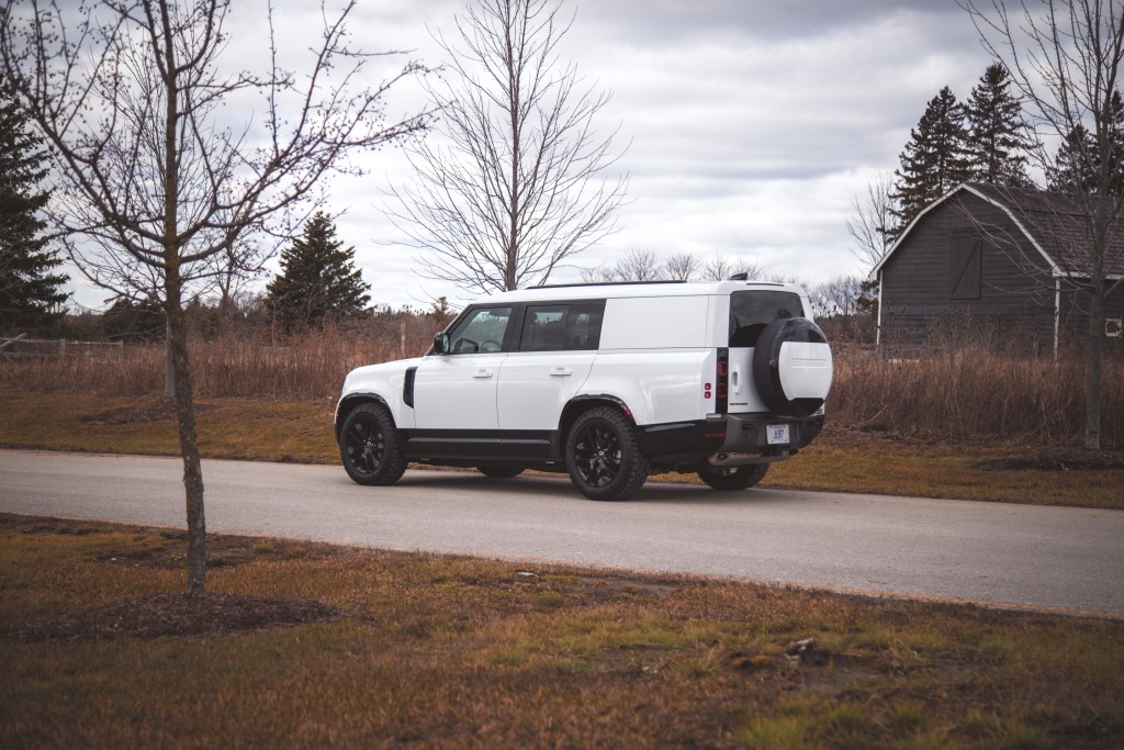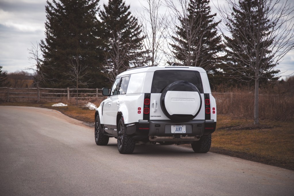 Also exclusive to Outbound is a Shadow Atlas Matt finish to the exterior elements, such as the bumpers, grill insert, and wheel spokes. Paint colours are limited to four: Santorini Black, Eiger Grey, Carpathian Grey, and the Fuji White on our test vehicle. But it’s not often that you see a Defender optioned with a matching roof colour instead of a contrasting black. The Outbound package also covers the rear windows in the body paint colour, in this case, Fuji White. It’s a unique look that gives it Ford Flex vibes from the side but admittedly looks a bit naked and bare without any of the optional roof racks, mud flaps, or a side-mounted carrier box. These can be equipped on the Outbound via the Explorer Pack ($5,159) or Adventure Pack ($2,268). Of note, the Defender 130 is 337 mm longer than the 110 and the majority of that length is added behind the rear axle, exaggerating the rear overhang like a loaded diaper.