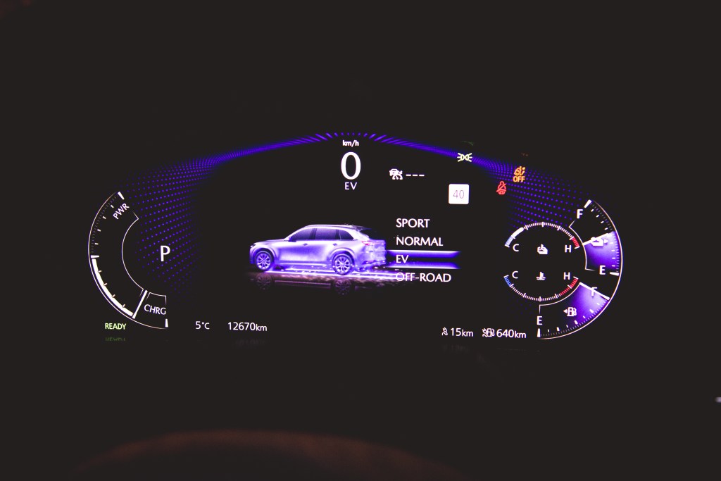 We drove the CX-90 PHEV, which is equipped with a 2.5-litre turbocharged four-cylinder engine paired with an electric motor and battery, for a total output of 323 horsepower. We aren’t particularly smitten with this powertrain. It’s perhaps the roughest and most unpolished turbo-four we have ever driven. Vibrations unsettle the upscale vibe of the interior every time the engine revs up, and it abruptly and quite audibly shudders the car from side to side, which is often due to the effectiveness of the battery system. Engine cut-off happens way more often here than in some standard hybrids like the Lexus RX 350h.